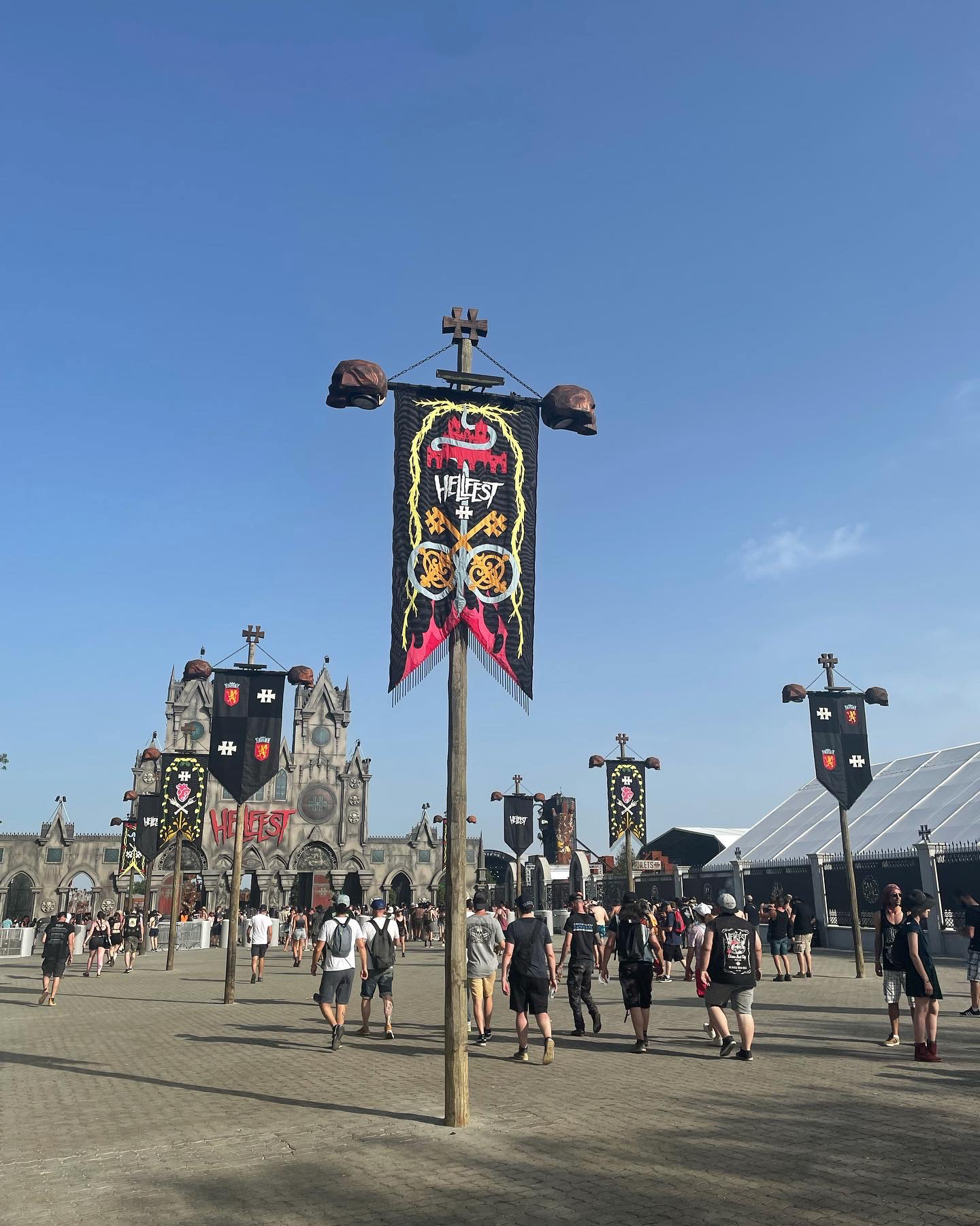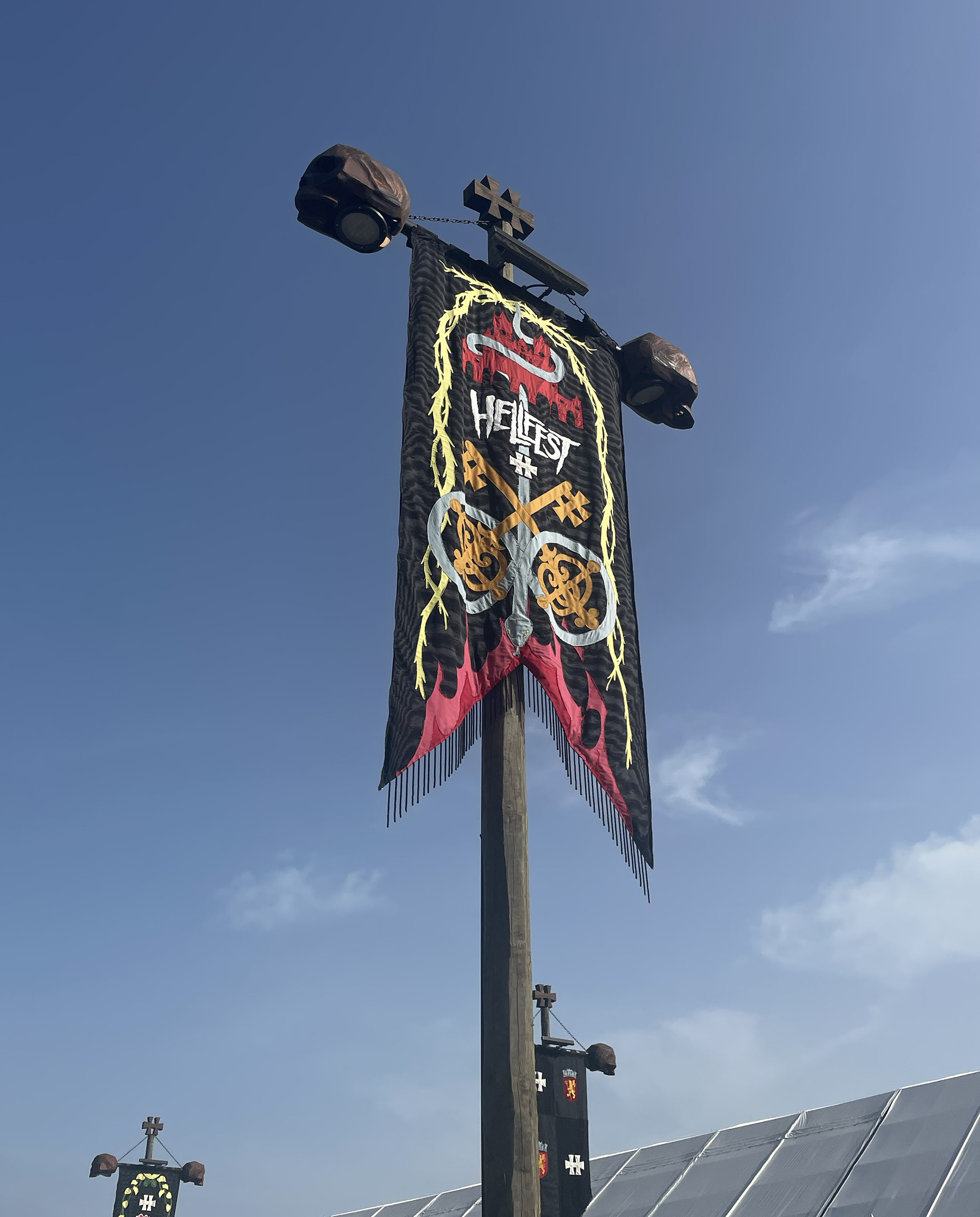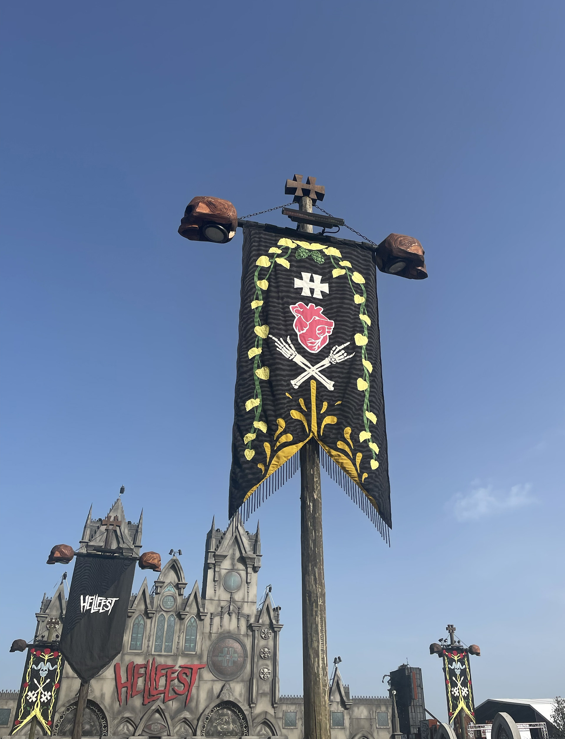 For Hellfest 2022 we created a collection of 10 banners on wooden poles with the help of many talented persons - Charlotte Tessier, Valentin Beauvineau, Valerie Mabile, Mirage Mirage, Clack and many others...